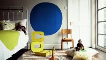 Har du dårlig tid? Prøv å male én stor sirkel for å lage en leken fondvegg. Velg en farge som står i kontrast til den nåværende veggen, og tenk stort! Med litt tilbehør i samme farge som sirkelen kommer barnerommet til å føles som nytt på et blunk!