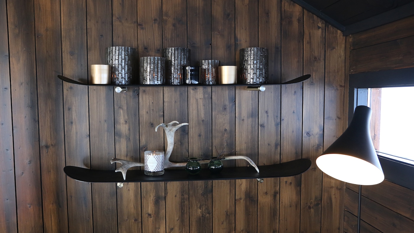 Spiler er sortmalt for og veggen er sortbeiset slik resten av hytten er.
