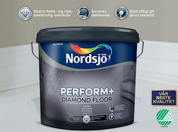 Nordsjø Perform+ Diamond Floor er en vanntynnbar, halvblank og slitesterk maling som kan brekkes i alle farger. Den er utviklet for innendørs bruk på tre, betong, og laminatgulv, som utsettes for normal slitasje i private boliger.