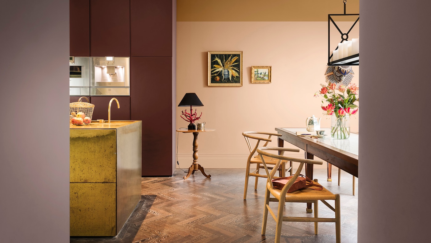 Sammenlignet med Heart Wood-paletten, som er basert på fargen Heart Wood, vil fargepaletten i større grad stenge ute støy og skape rom som gir oss mulighet til å finne balanse. Paletten du ser nedenfor utstråler varme og inneholder farger fra materialer med rike teksturer, som varmt treverk, lær, silke og fløyel såvel som messing og gylne metaller.