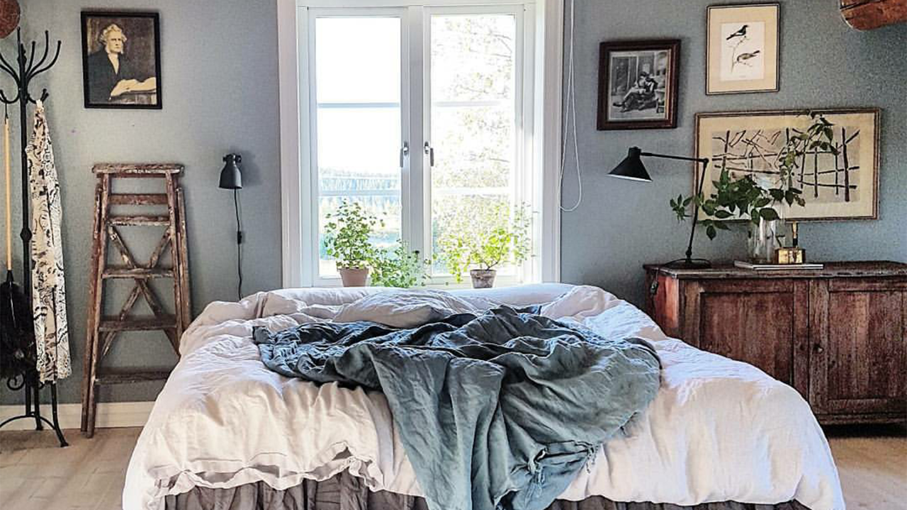 Ett av husets vakreste rom er soverommet, synes vi. Den herlige sengen får all den plass den behøver og flankeres av tremøbler med sjarmerende patina. Veggene er malt i den grågrønne fargen som heter Tant Johannas Gröna, som gir rommet et løft og mer personlighet uten å være påtrengende.