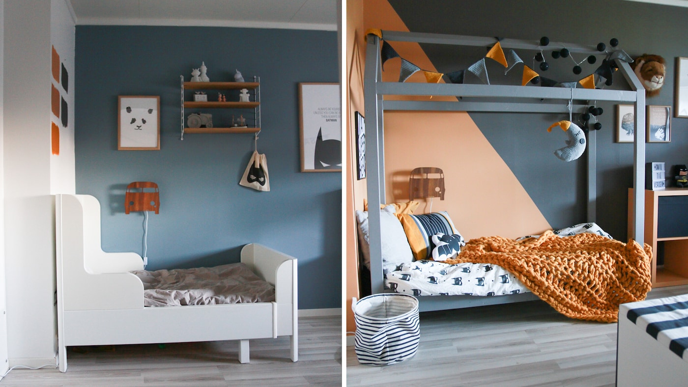 Fø og etterbildet av barnerommet. Førbildet viser fargen Denim Drift. Det nye rommet bærer preg av å huse en større gutt.